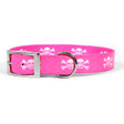 Our standard easy-clip designer collars are made in the U.S.A. of 100% vibrant color-fast polyester with durable plastic buckles, plastic slip locks, and a metal D-ring. Best of all they are washable!