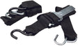 Constructed of black heavy-duty weather resistant webbing. Rust resistant plated "S" hook on each end. Center cam-action buckle adjusts length and tension. Hook & Loop closure pad helps to protect boat finish.